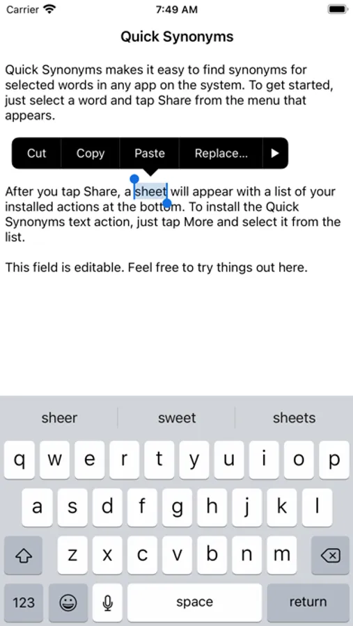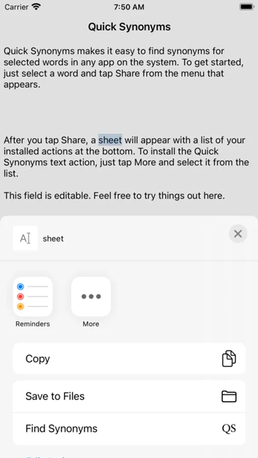 Quick Synonyms provides an iOS text action extension that makes it easy to look up synonyms for words in any app on the system.