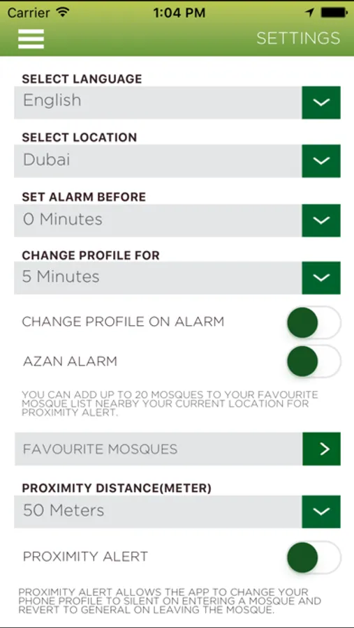 Switch to silent: The app will switch the phone to silent mode whenever the user is near a mosque and when it is prayer time. The app will automatically switch back to normal mode after a period of time