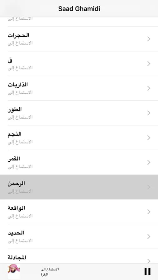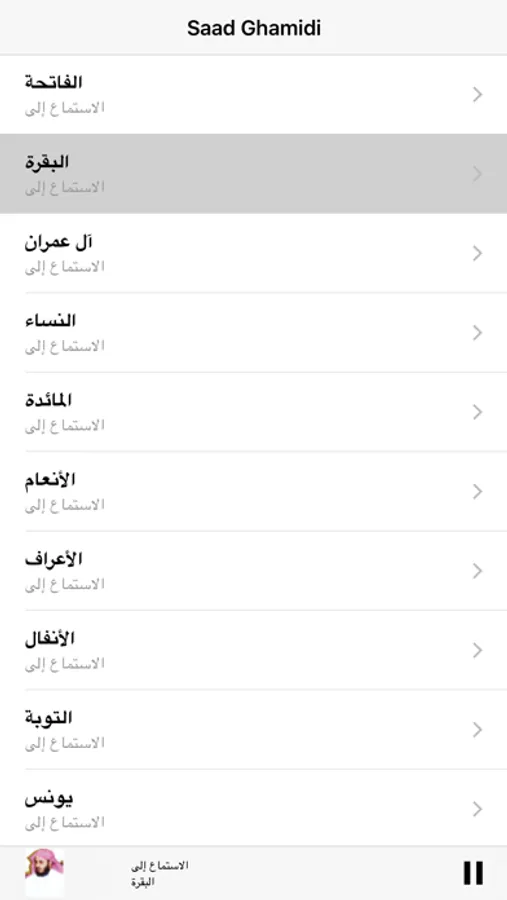 This app lets you listen to the recitation of the complete Coran(Koran or Kuran) by the well known reciter and sheikh al Ghamidi.