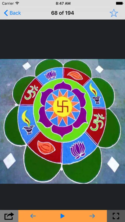 This App includes exciting collection of Rangoli designs like - Freehand rangoli design, God rangoli designs,
