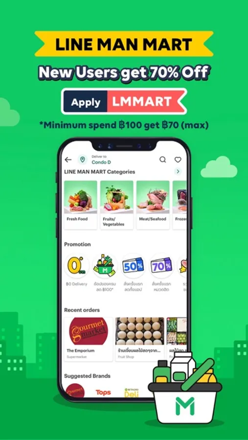 LINE MAN your number one supporter. More benefits, with integrated half price co-pay and "The more you spend, the more you get" campaign. Delivery fee starts at 0 baht and pays for meals along with up to 60% discount code. Download now.