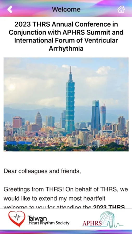 Greetings from THRS! On behalf of THRS, we would like to extend my most heartfelt welcome to you for attending the 2023 THRS Annual Conference in Conjunction with APHRS Summit and International Forum of Ventricular Arrhythmia which will be a physical conference from March 18 to 19, 2023 in Taipei, Taiwan.
