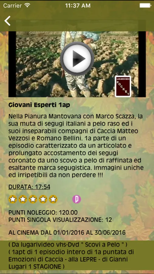 Lugari Pocket è l'applicazione che ti consente di accedere on demand AD UN MIGLIAIO di video della Lugari Video SUDDIVISI NELLE SPECIALISTICHE SERIE DI: Caccia al CINGHIALE in battuta, alla LEPRE con i cani da seguita, a BECCACCE con i cani da ferma, Caccia al COLOMBACCIO con Volantini e Zimbelli, Caccia da Appostamento ad ANATIDI E OCHE, Caccia di SELEZIONE agli UNGULATI, Caccia da CAPANNO con Richiami cantori, Cacce DA PRATO e ALLA PICCOLA MIGRATORIA, Caccia con il CANE DA FERMA E DA CERCA.