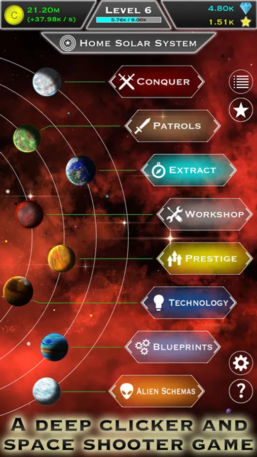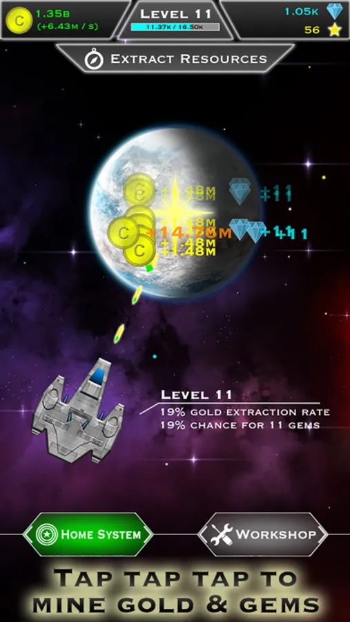 - Explore resource planets and tap as fast as you can to manually extract gold and gems for upgrades.