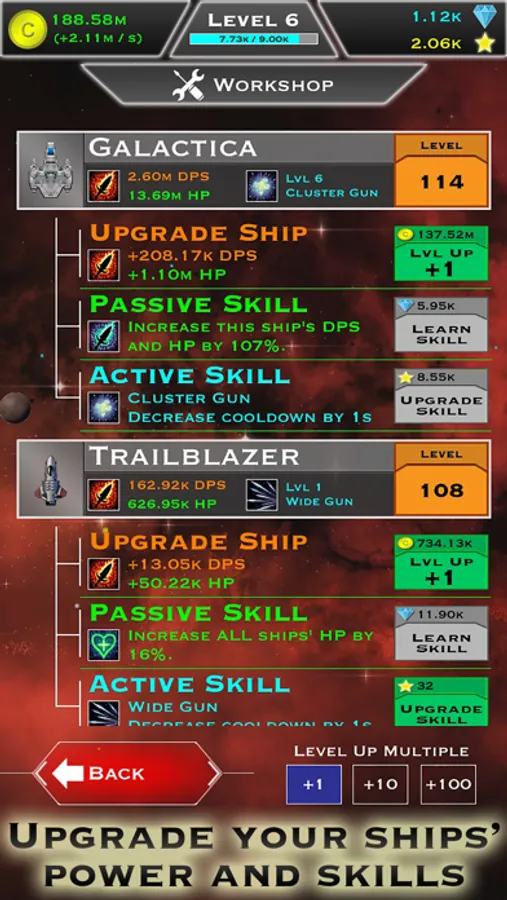 - Upgrade your ships' damage, health, and skills in the Workshop to make them more and more powerful.