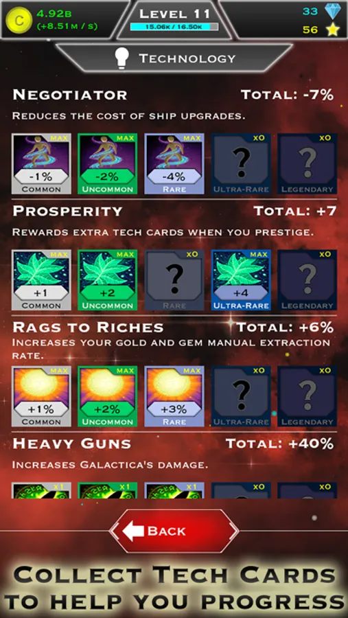 - Over 150 unique permanent Tech Cards that effect and benefit you in every aspect of the game, from tapping to idling to conquering.