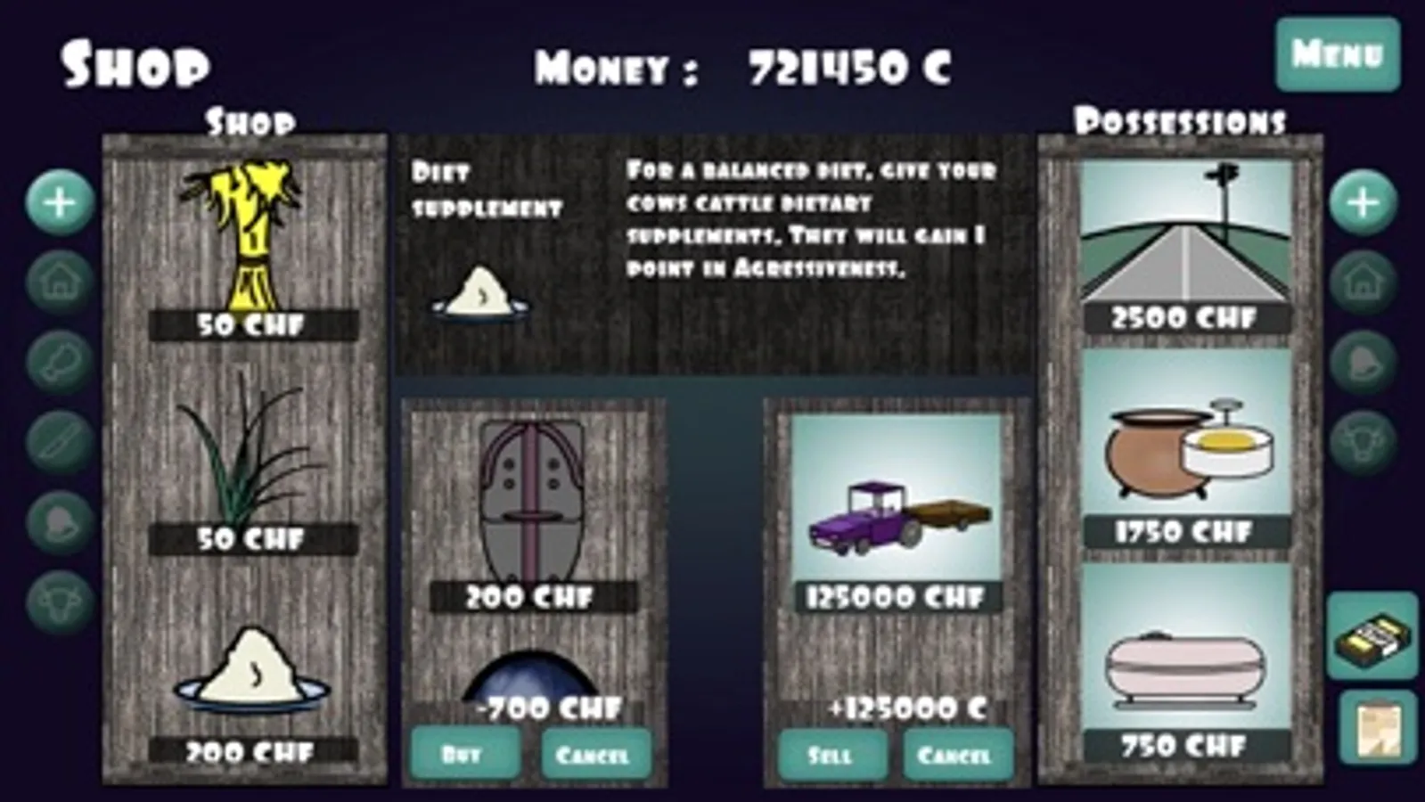Gameplay: Buy some cows, lead them to the arena, improve your farm and become the best cow breeder the Rhône Valley has ever encountered! Confront your cows to others, compare scores to increase your strengths and reduce your weaknesses. Take care of your fighters' health and their performance will not disappoint you. Vitality, strength, speed, aggressiveness and confidence will soon become your only goals.