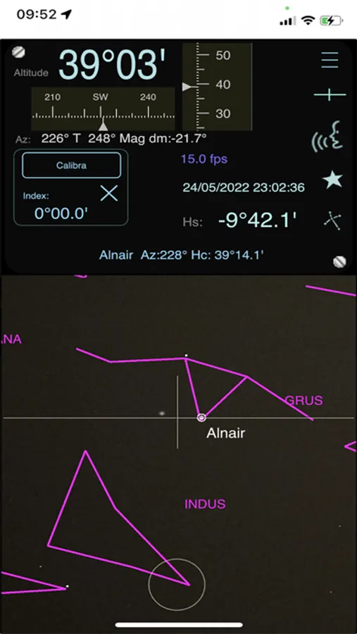 Stars and planets shown on screen in real time. Show constellation names and lines. Identify planets and navigation stars (from Hipparchus 150 catalog). The program can also speak the star names and altitudes (audio).