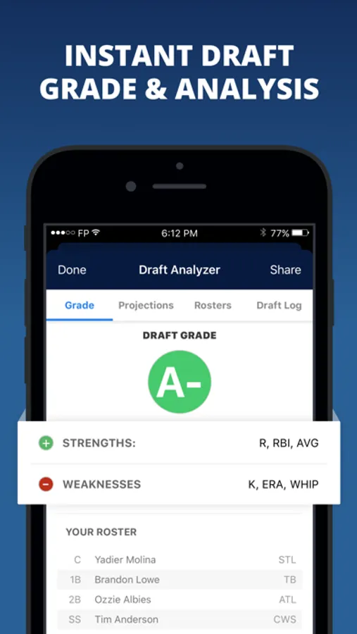 Sync with your live draft to get expert advice on who to pick for each round, while your draft unfolds in real-time. Drafted players will be automatically tracked for you.