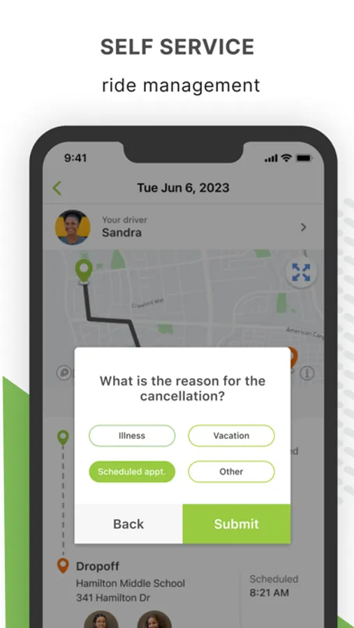- Easily communicate changes or cancel a ride if a child is sick or absent