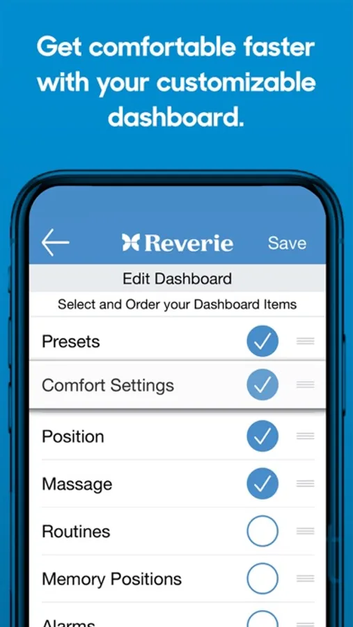 Reverie Nightstand™ V2 allows you to operate your Reverie adjustable power base from your iOS devices. The app has all of the features of your remote, plus: