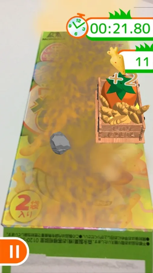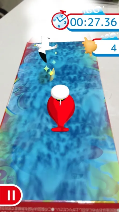 おっとっとのパッケージにこのアプリをかざすと、パッケージの上にとと丸のAR(拡張現実)ゲームが表示されます。