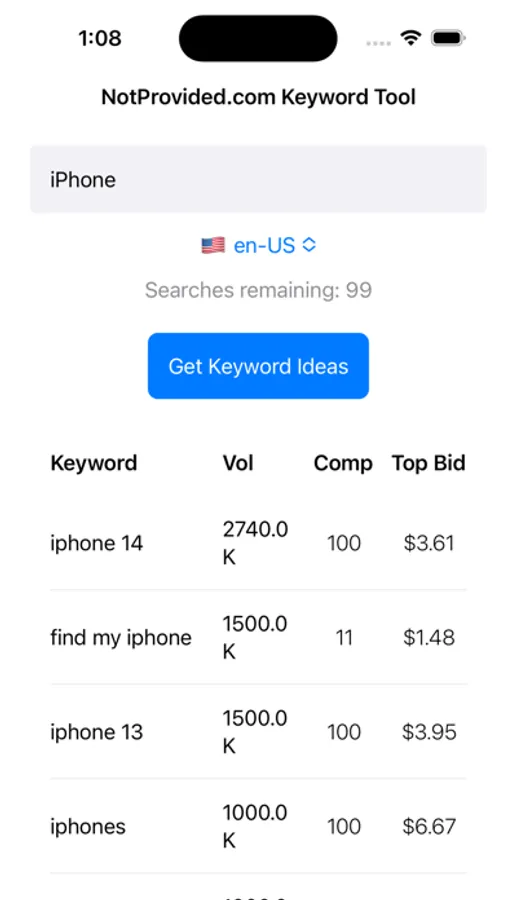 Download and use Keyword Tool App for free, or upgrade to Keyword Tool App Pro to unlock even more powerful keyword data: