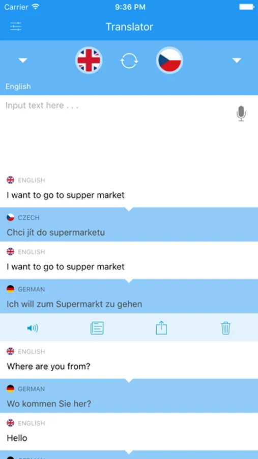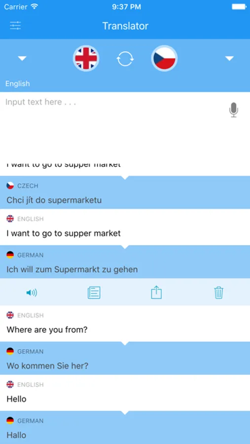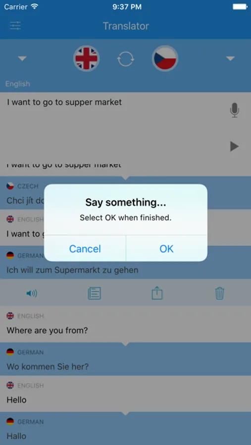 Share your translation via social networks (Facebook, Twitter, WhatsApp, Instagram) or SMS, Bluetooth, Email, or Wi-Fi.