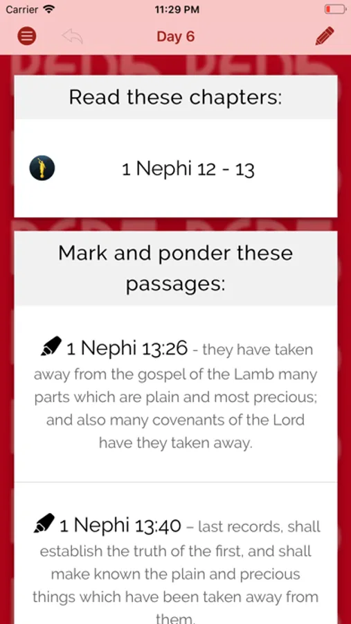 Each day you have approximately 5 pages of the Book of Mormon to read along with verses to mark and/or memorize. There are also things to ponder over, and a place for you to write down your thoughts and feelings in response to questions in each day's assignment.