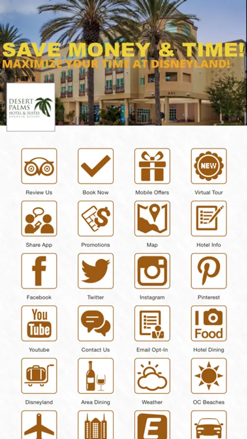 This app allows users to engage with Hotel Desert Palms using various features like Facebook, TripAdvisor, YouTube and many more..