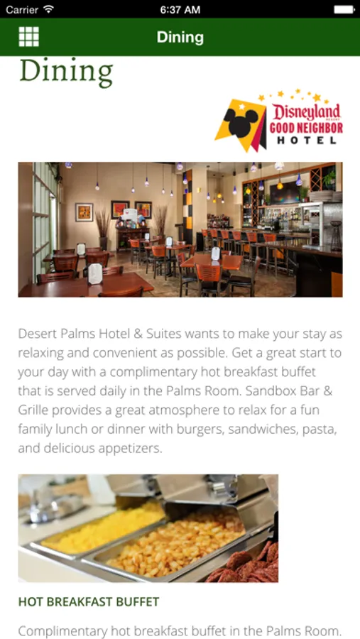 Get a great start to the day for the whole family with a complimentary hot breakfast buffet that is served daily in the Palms Room when you book direct with Desert Palms Hotel.