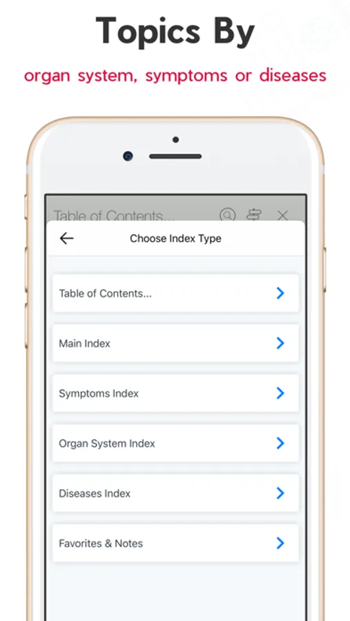 With MobileDDx™ you can choose to explore topics by organ system, symptoms or diseases only, or search across all topics. For example, if you wish to review the causes of a patient's chief complaint, simply select the symptom or sign from the main index. If you have made a diagnosis and wonder what other disorders to consider, select your diagnosis from the list to see its differential diagnoses.