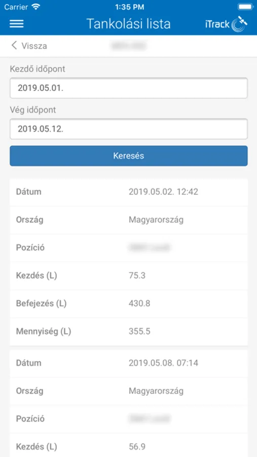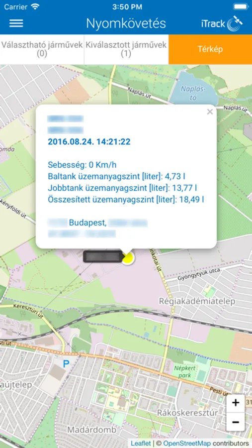 - A jármű részletes tankolási adatainak listázása: pontos helyszín és időpont, valamint a tankolás előtti és utáni üzemanyag-mennyisége