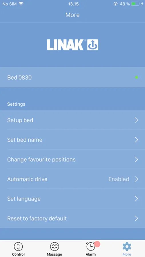 Use your mobile device to adjust your LINAK®-powered comfort bed. This app works with all LINAK TWINDRIVE® dual actuator systems as well as with the LINAK Bluetooth® adapter. The app works via Bluetooth® Low Energy. Specific features are only available for some bed systems.