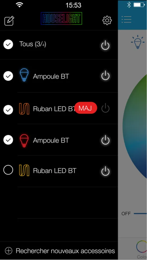 L’application vous permet de contrôler les ampoules LED multicolores de la gamme HouseLight. Choisissez la couleur, l’intensité permettant de personnaliser l’éclairage en fonction de l’ambiance et de vos envies. Profitez des effets intégrés comme le changement de couleur permanent ou en fonction de la musique. Créez vos propres scénarios pour chacune de vos lampes. L’application Houselight peut également vous prévenir lorsque vous recevez un sms ou une notification.
