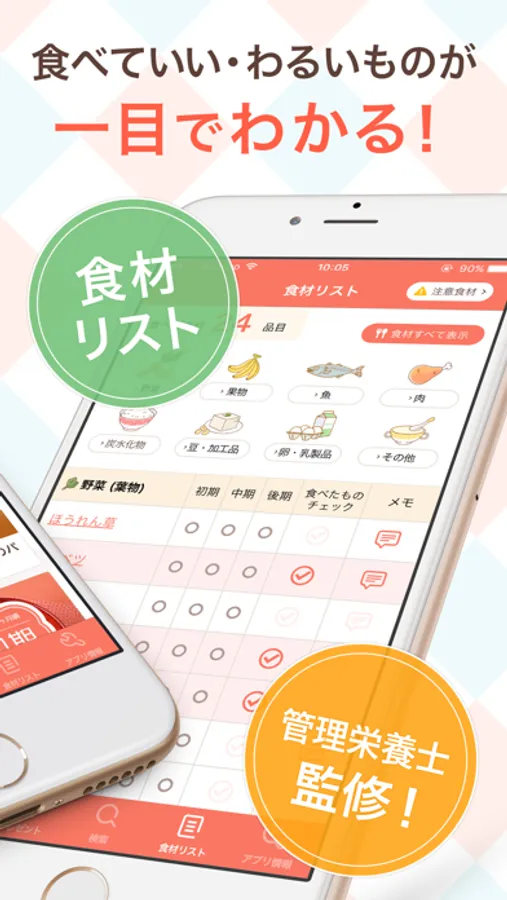 管理栄養士監修により、赤ちゃんに与えてはいけない食材や、食べる時に注意が必要な食材をしっかりと網羅。食材リストから一目で確認できます。