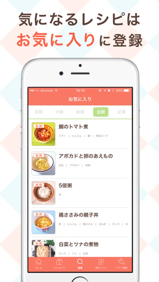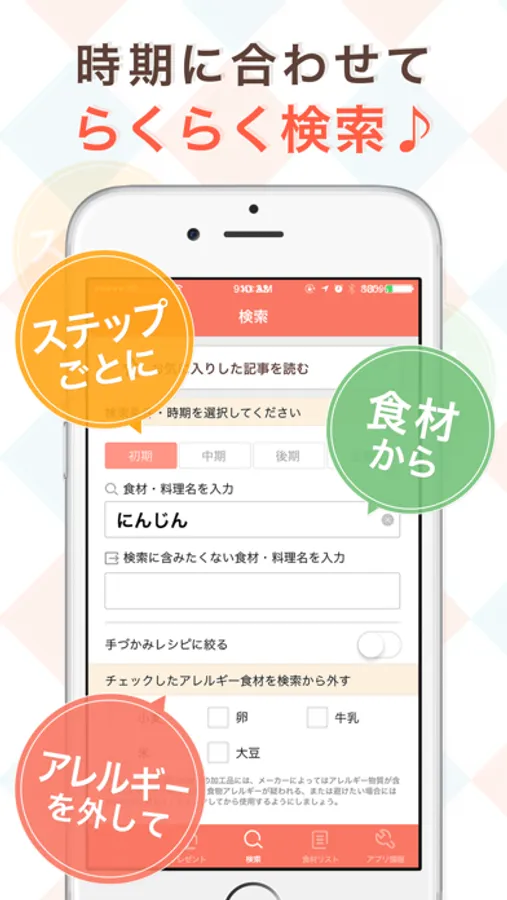初期・中期・後期のステップや赤ちゃんに食べさせたい食材に合わせて、レシピを探しやすくしました。