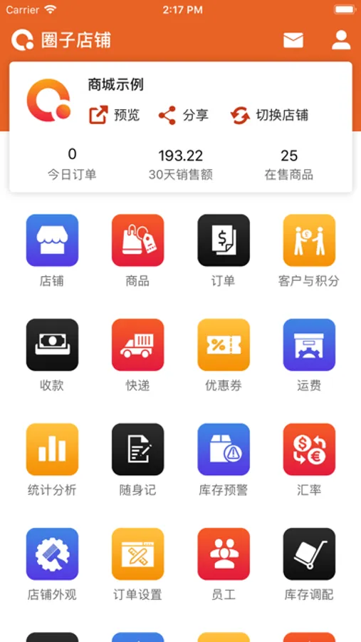 支持多国语言和货币的全功能电商系统,涵盖所有开店所需功能:订单和商品管理,绑定域名,供应商与库存,客户积分和营销,多店铺和员工管理,社交平台分享与下单等。同时支持跨平台操作,手机App与电脑网页后台同时管理。