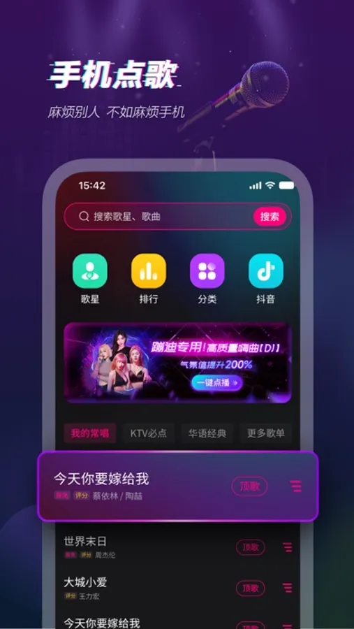 多唱app:超好用的多元化手机点歌APP,通过手机扫码连接点歌机后,进行点歌,播控等操作,还有影院,电音派对、学唱歌等功能,超多玩法。另外超有趣的包厢互动神器,助你嗨翻全场。