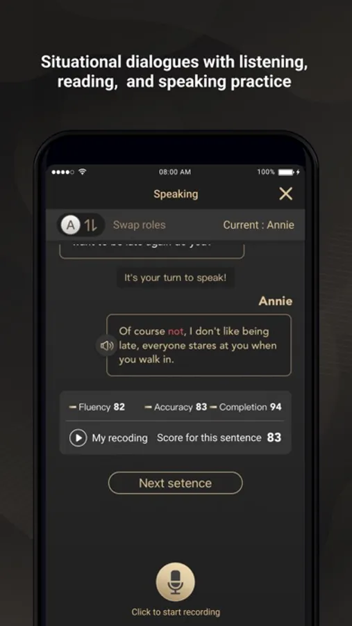 *AI pronunciation analysis: Situational dialogues with listening, reading, and speaking practice