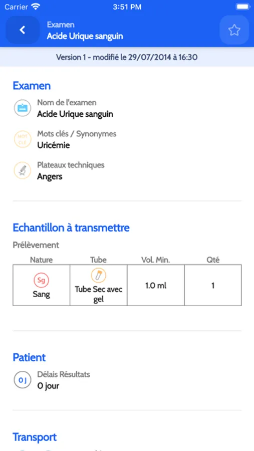 Cette application permet un accès simple, rapide et intuitif à un vaste répertoire d’analyse médicale. Chaque analyse possède une fiche descriptive rappelant les informations nécessaires : nature, tube, température de conservation, délais avant résultat, volume de prélèvement…