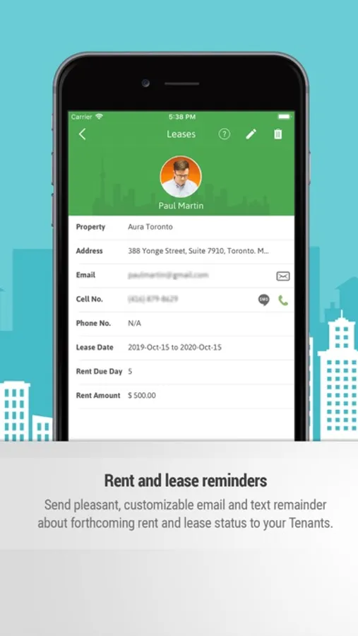 Modify and view current tenant payments made, send rent receipts, lease details and auto reminders for the lease end, rent reminder and store prospective tenants information.