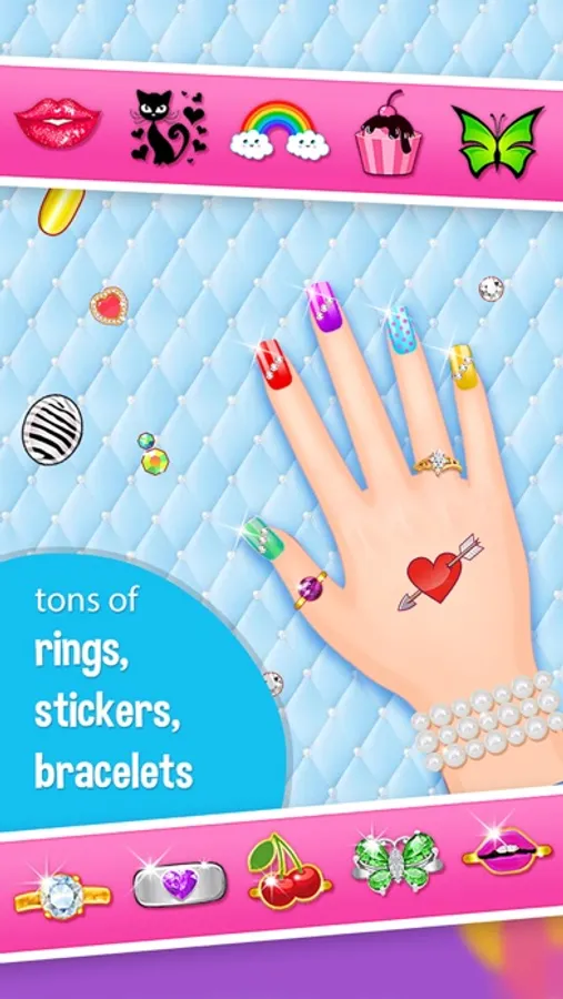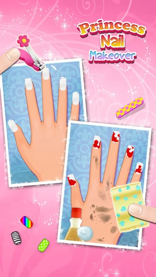 Choose from tons of glamorous polish colors, rings, stickers , bracelets, patterns and more to decorate your nails. Cut, smooth, polish and care for broken nails. Enjoy amazing experience of princess nail salon.