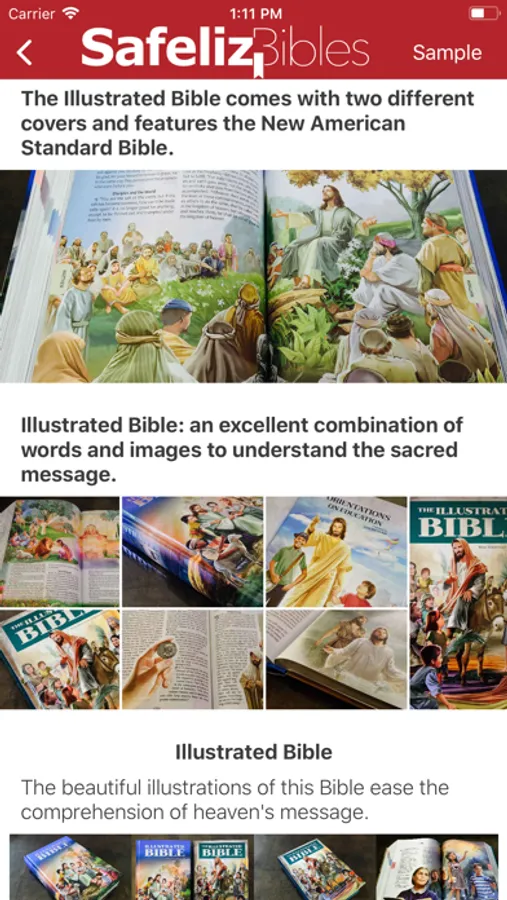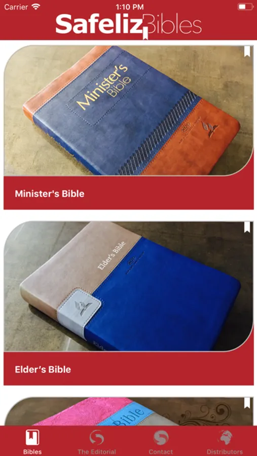 App Safeliz Bibles allows to see all the Bible editions published by Safeliz in cooperation with the General Conference of the Seventh-day Adventist Church. Discover their colors, covers, and additional resources. Available in three languages: Spanish, English, and French. You will be able to see images of each one of the Scripture presentations, and a gallery of photos of the tables and the inside content. Find all the information about the Woman's Bible, Pathfinder Bible, Elder's Bible, Deacon's and Deaconess's Bible, Disciple's Bible, Bilingual Bible, and more. Know our distributors around the world.