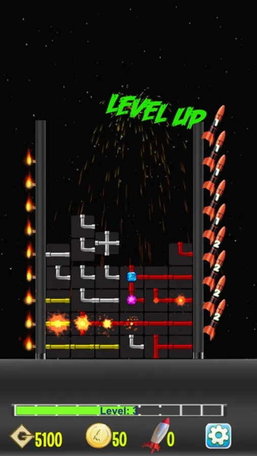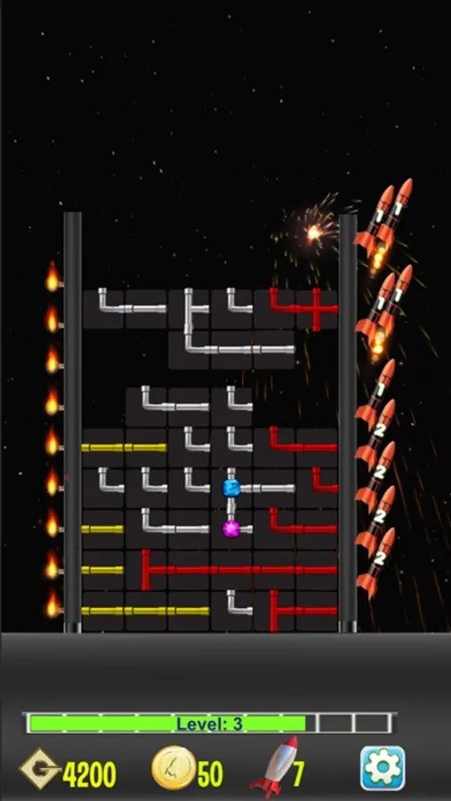 Rotating Tile on a grid in order to form a path between sources of flame on the left and firework rockets on the right, two are connected, the rockets launch, you will earning points.