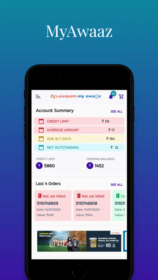 MyAwaaz App is for Asian Paints Dealers. Through this app dealers can access reports ,transactions and place orders.