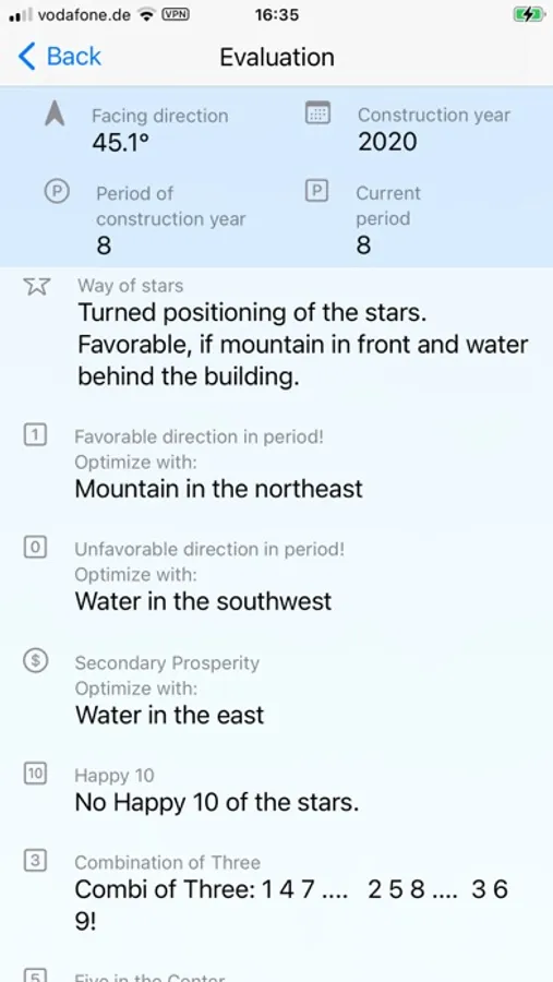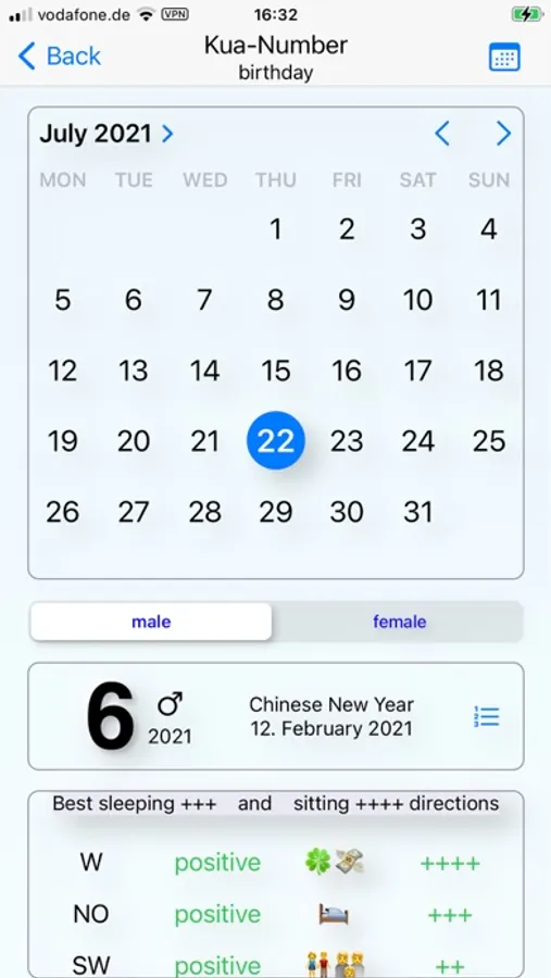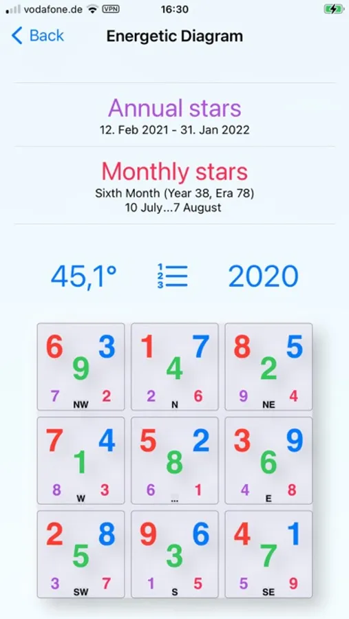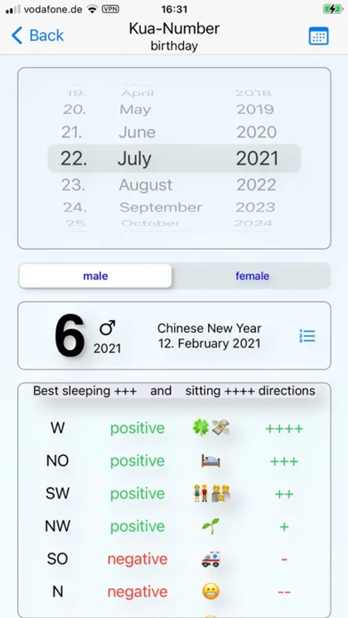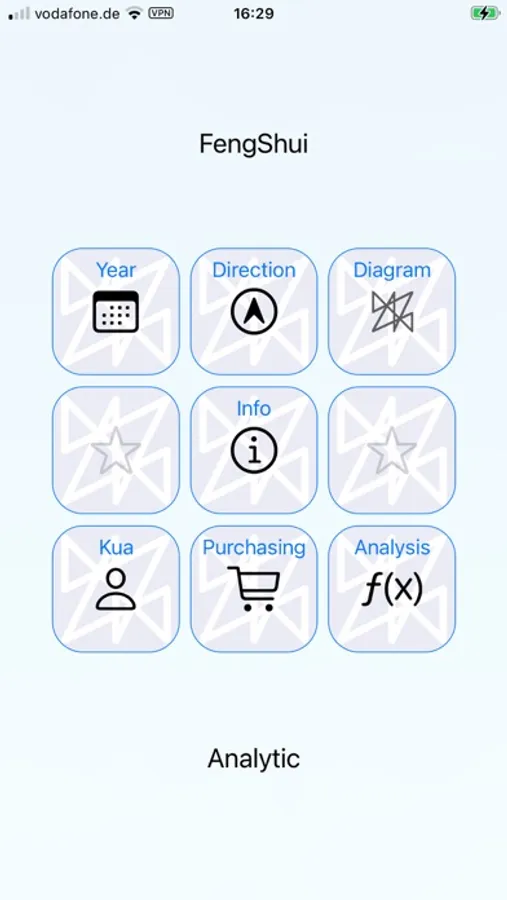 Professional tool to analyze FengShui "Flying Stars" and to calculate the Kua-Number of a person (incl. Chinese New Year correction). Displaying the "Compass-Method" (Eight Trigrams) with its positive and negative areas in realtime when facing/seating changes.
