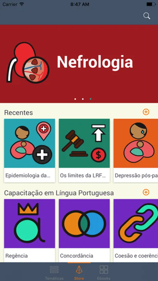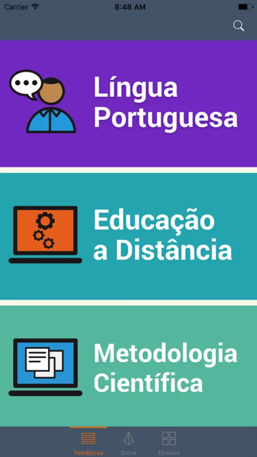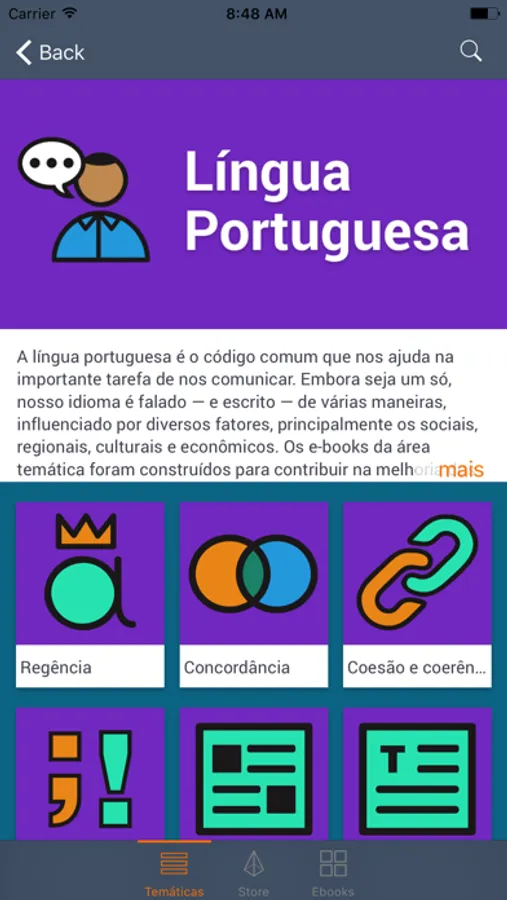 Os livros, que apresentam um design atrativo e animações gráficas interativas, estão categorizados em diferentes áreas temáticas.