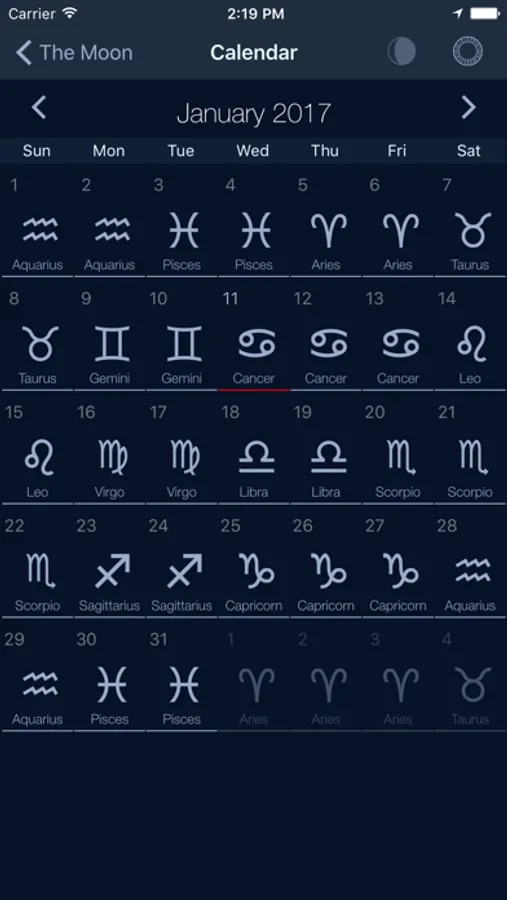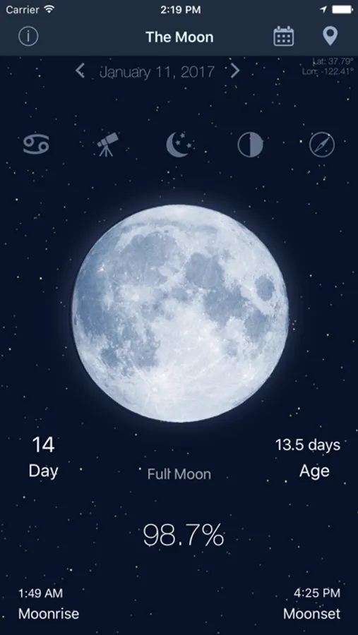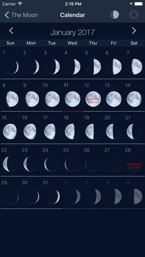 Moon Phases Calendar - universal lunar calendar for any Locations from 0001 to 2100 years.