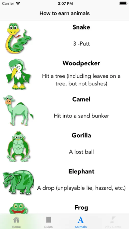 Zookeeper Golf helps you keep track of who owns each animal, when (which hole) each animal entered their zoo, and will compute the damage at the end of the round. There is a complete set of rules included in the app. Best of all, the app has 27 animals in its menagerie: The nine most common bad shots (3-putts, bunkers, lost balls, etc.) are available for free. The somewhat less common ones (hitting a house, hitting a golf cart, 4-putting) can be purchased in the app. These animals reflect years of playing golf with people who aren't all that good at playing golf, and hard as it may be to believe, each animal was placed in a zoo at least once.