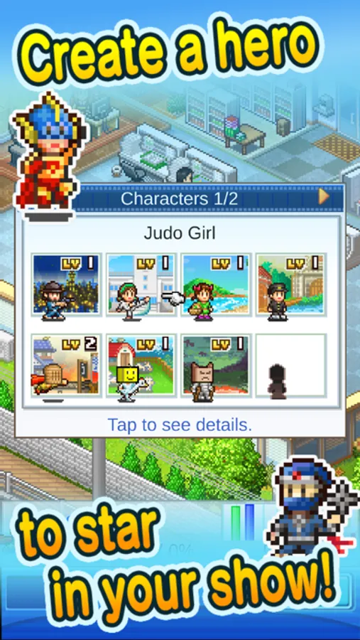Select a face, body, and presto! Your completed hero can then explode onto the scene of your show, wowing watchers to rule the rankings! Categories include "Dateability," "Popular with Kids," and more! As the animaestro, only you can bring status to your studio!