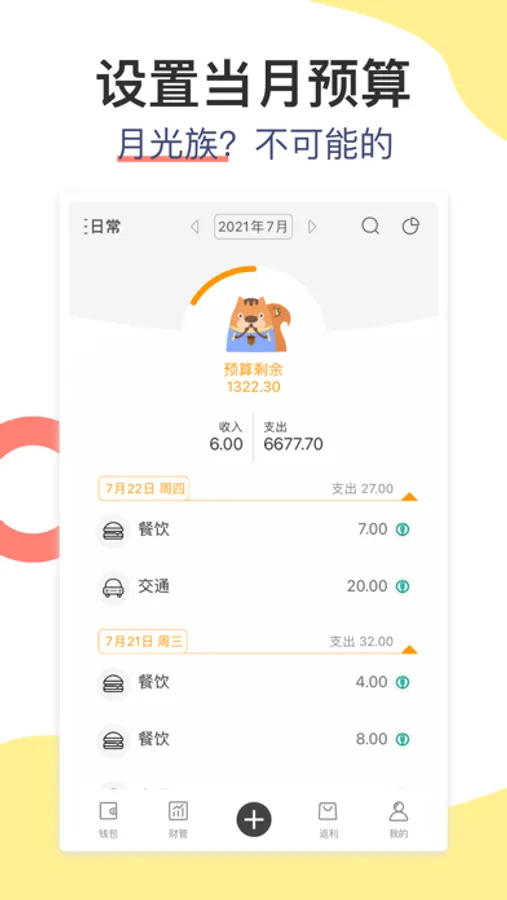 4)制约剁手:设置当月预算,月光不再怕,小松鼠随时提醒剩余花销。