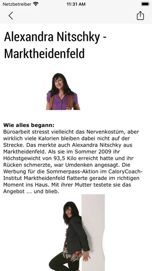 Informationen wie die Öffnungszeiten der CaloryCoach-Institute, Kontaktdaten, Fotos, Erfolgsgeschichten, sowie Ernährungs- & Trainingstipps sind sofort verfügbar und können sofort per E-Mail zu Freunden gesendet werden.