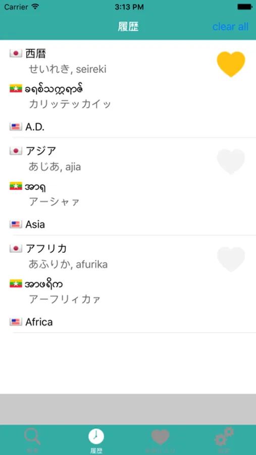 4. You can review immediately registered for each category to my favorites and with a heart in the translation you want to see again later.