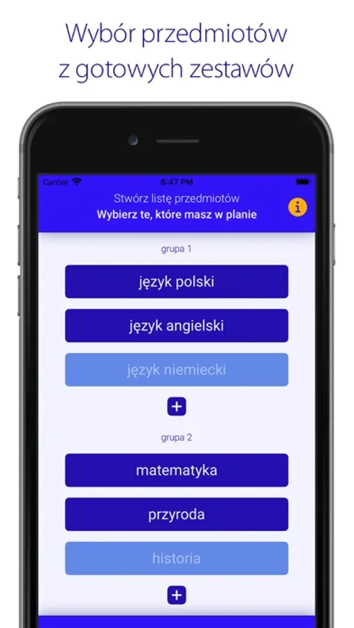 • swoje PRZEDMIOTY WYBIERASZ Z GOTOWEJ LISTY, która jest dopasowana do wybranego poziomu edukacji (podstawówka: klasy 1-3, 4-6, 7-8 oraz szkoła średnia),