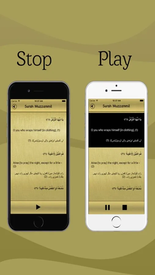 • Beautiful design of start playing Surah audio Option and while on reading as well