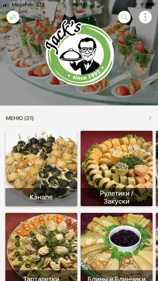 В мобильном приложении Jack’s в меню представлены в различных вариантах подачи и сервировки вкуснейшие тарталетки, канапе всех мыслимых и немыслимых видов и вкусов, удобнейшие рулетики и восхитительные закуски, тающие во рту десерты, фирменная пицца Джекс более 100 разновидностей и аутентичные осетинские пироги, спасающие от голода ланч-боксы, сэндвичи всех форматов и комплектаций, блины в стопках и с начинками в различных вариантах, удивительные салаты, безупречные горячие блюда, всевозможные пирожки и пироги как у бабушки из печки, торты и многое другое.