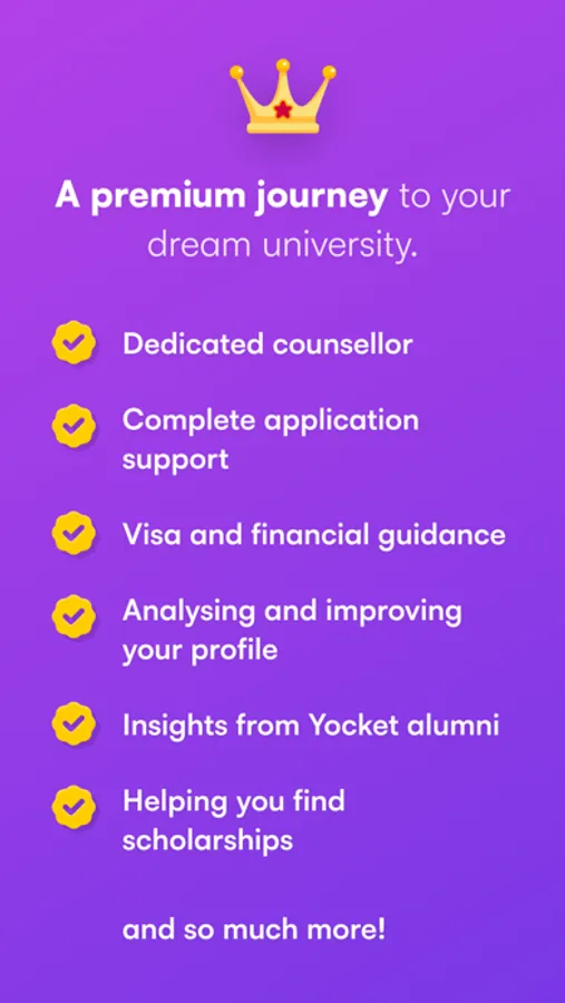 Yocket Premium is all about interacting with our experienced, and trust-worthy study abroad experts. Over 1,000 students have got admission in top 100 universities globally like Harvard University, MIT, UCBerkeley, among lots others! If you are lost in the sea of options, we have curated services like loan assistance, health and travel insurance, and more that benefit you the most - right in your app.