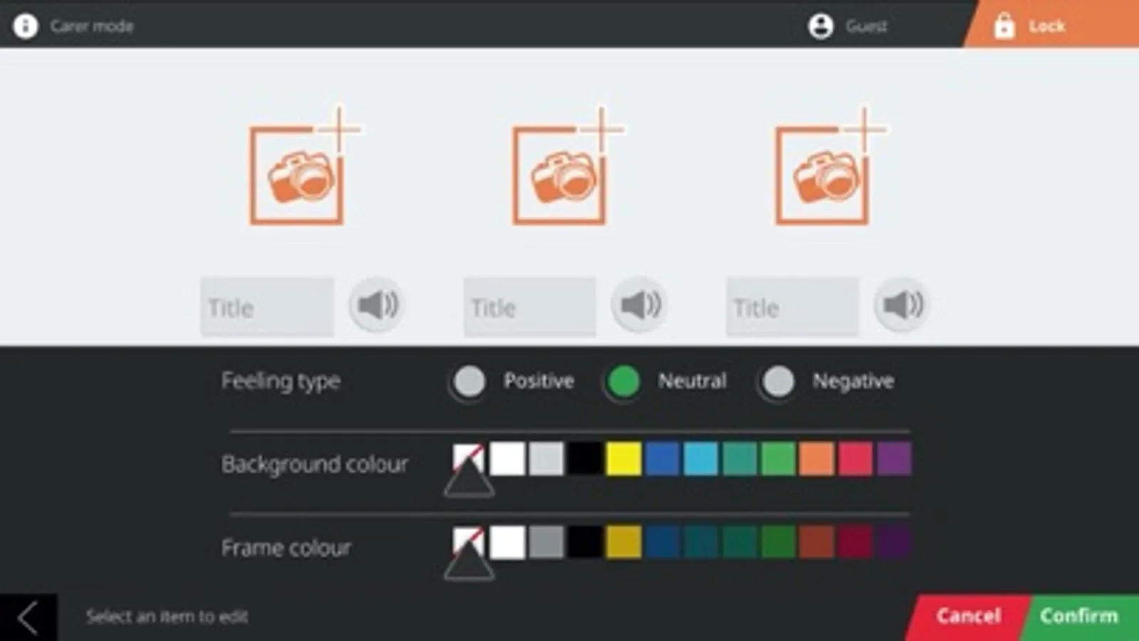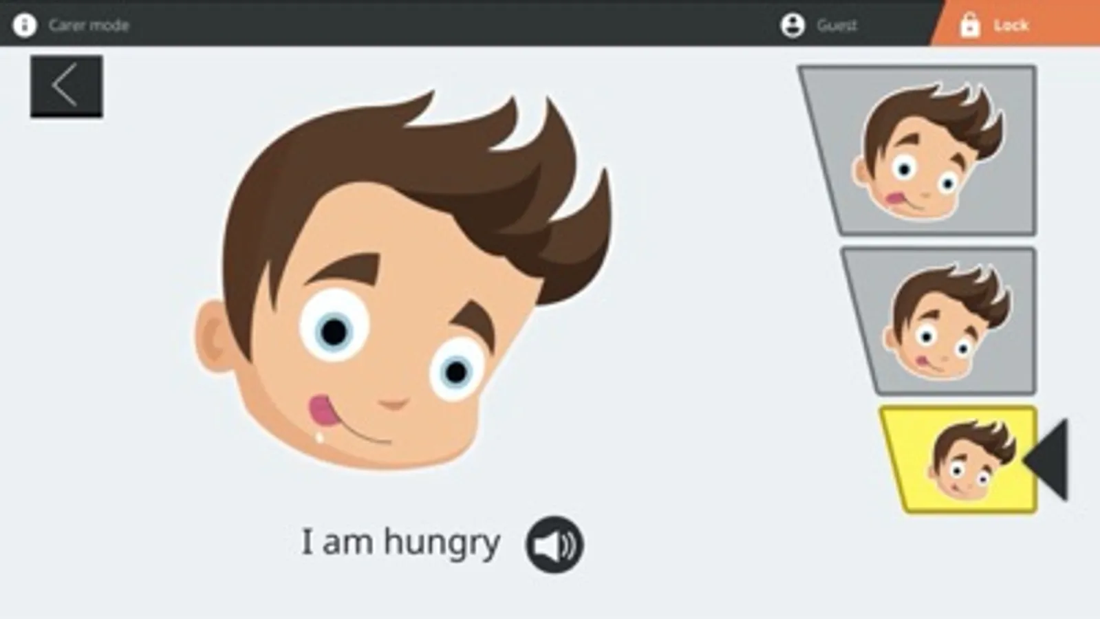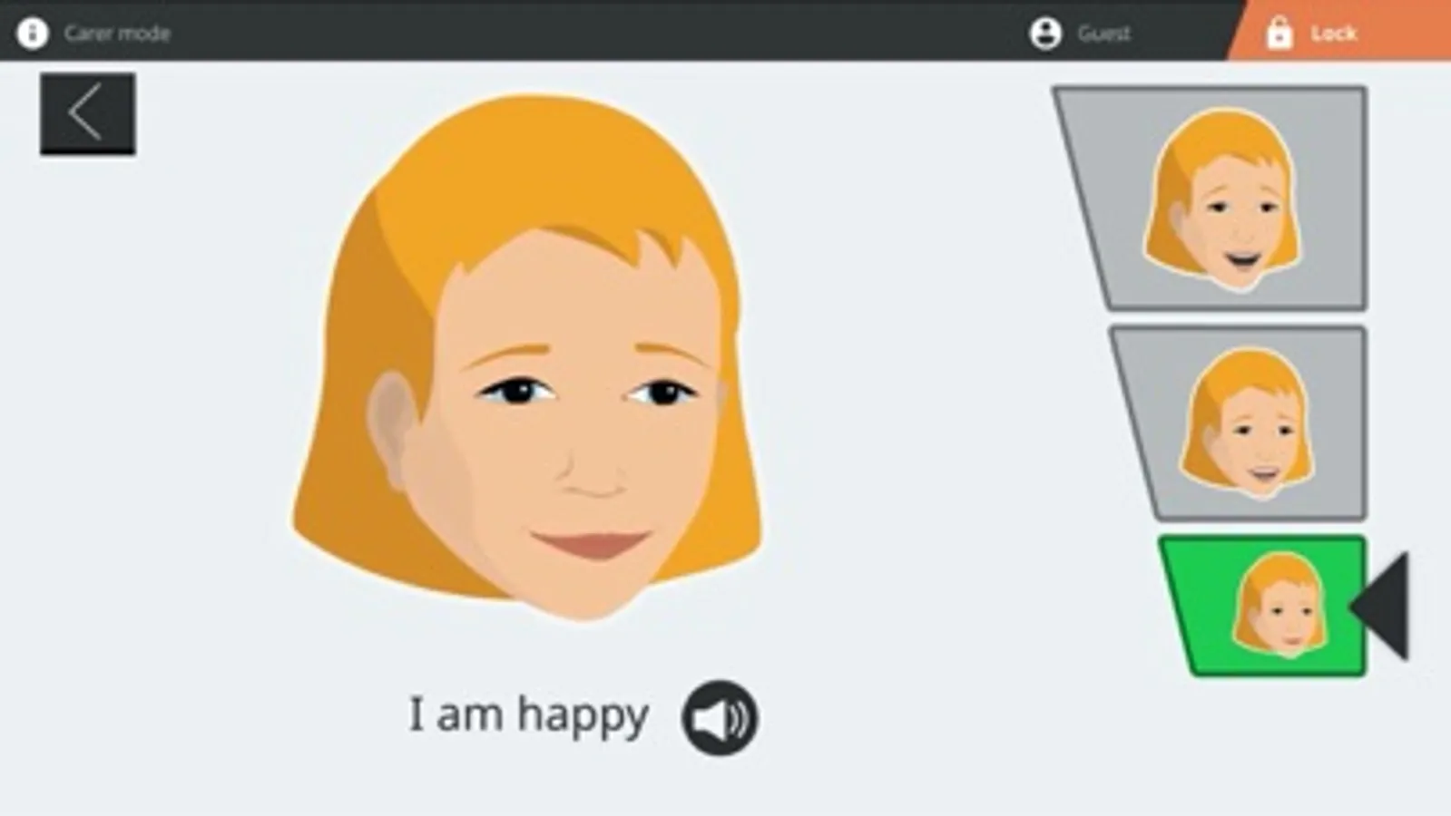 Tip: Configure the display: choose an avatar and add photos. If you already use pictograms for emotions or needs, add them in the application to use instead of those provided by default. Start by putting one or two images on the screen only by covering the rest, then gradually display the others as needed.