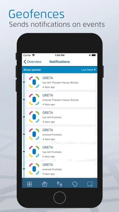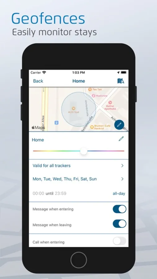 You can set up geofences in the Prothelis app. These allow you to be notified when your tracker enters or leaves this area.